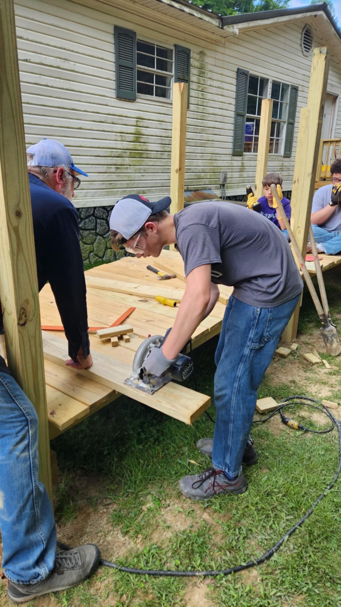My son measuring and cutting a board for the wheelchair access ramp earlier this Summer.